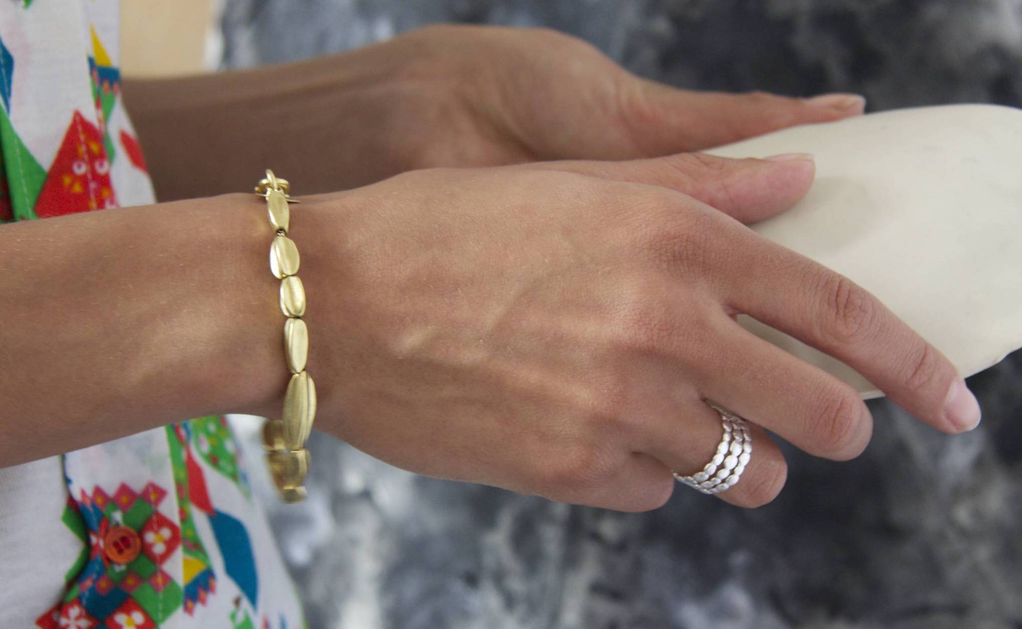 Strong, undulating forms in movement create the Baluba bracelet. Finished with our signature flower heart and Babylon clasp.