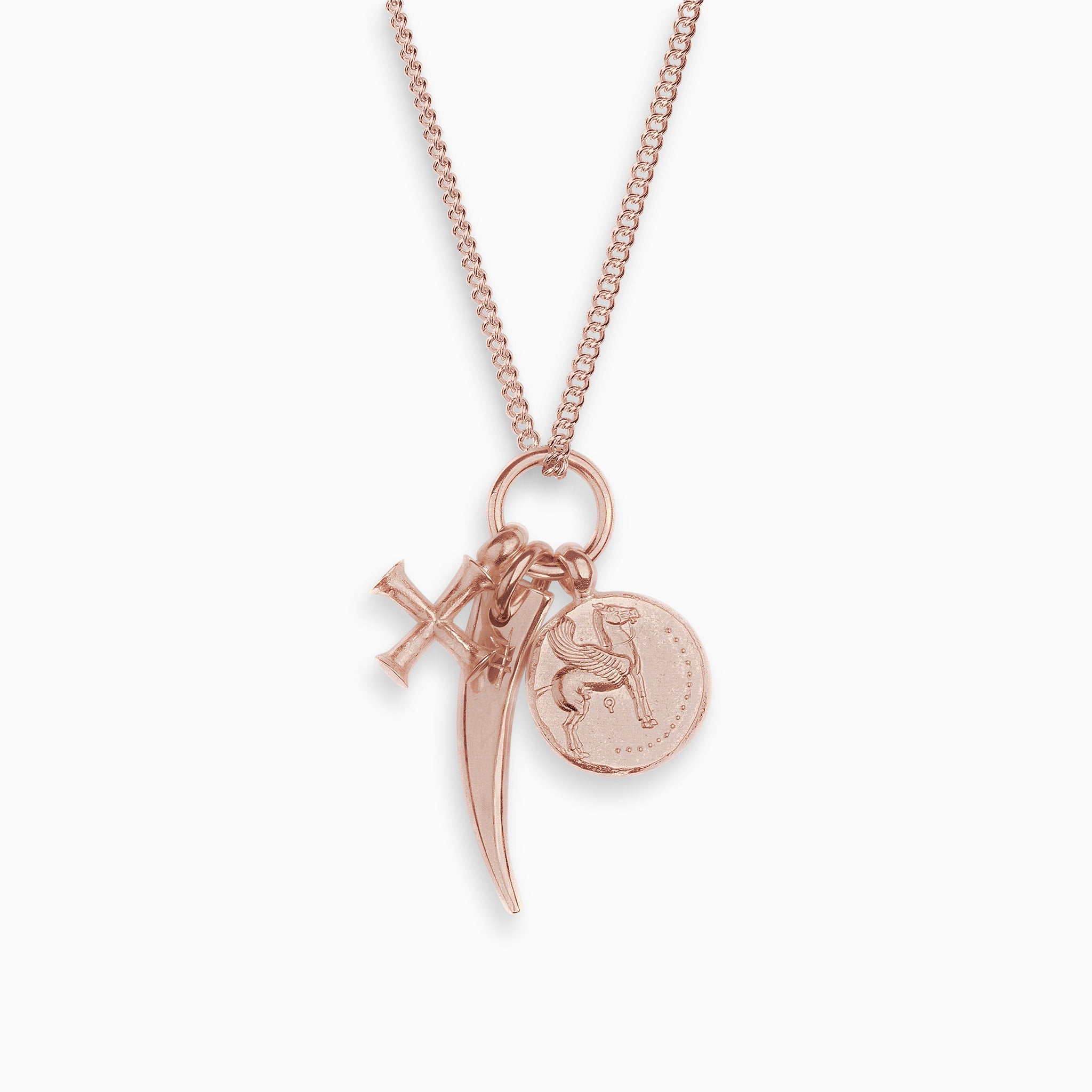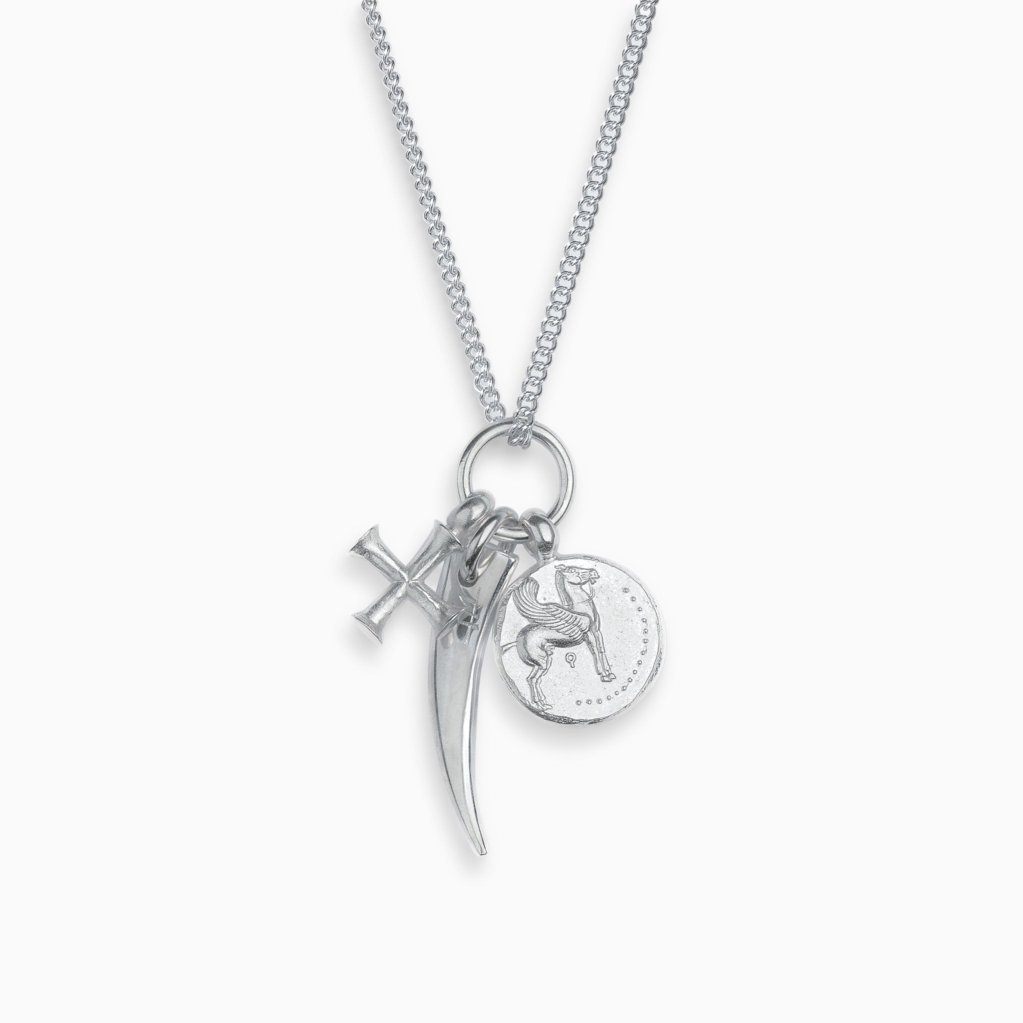 Congo pendant length 37mm. Pegasus pendant length 25mm. Byzantine cross pendant length 21mm. Heavy curb chain length 55cm.