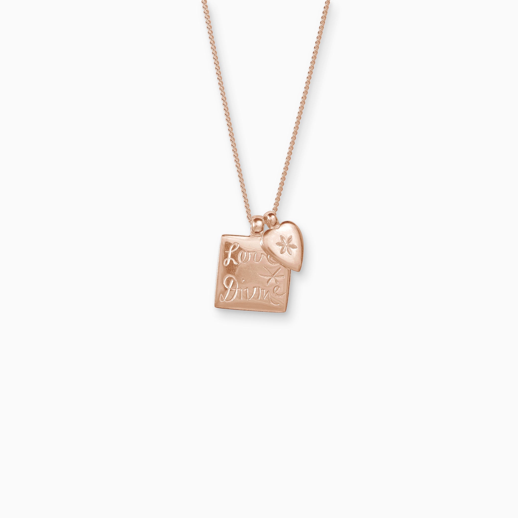 We love the interplay of thought, symbol and shape. Here we have paired our “Love Divine” charm with our signature flower heart. Doubly romantic.