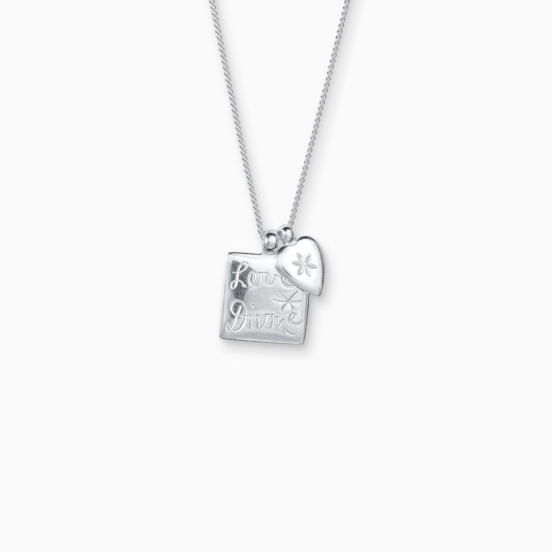 Handmade in London. Love Divine charms 21mm x 15mm, Flower Heart charm 15mm x 9mm, chain 45cm.