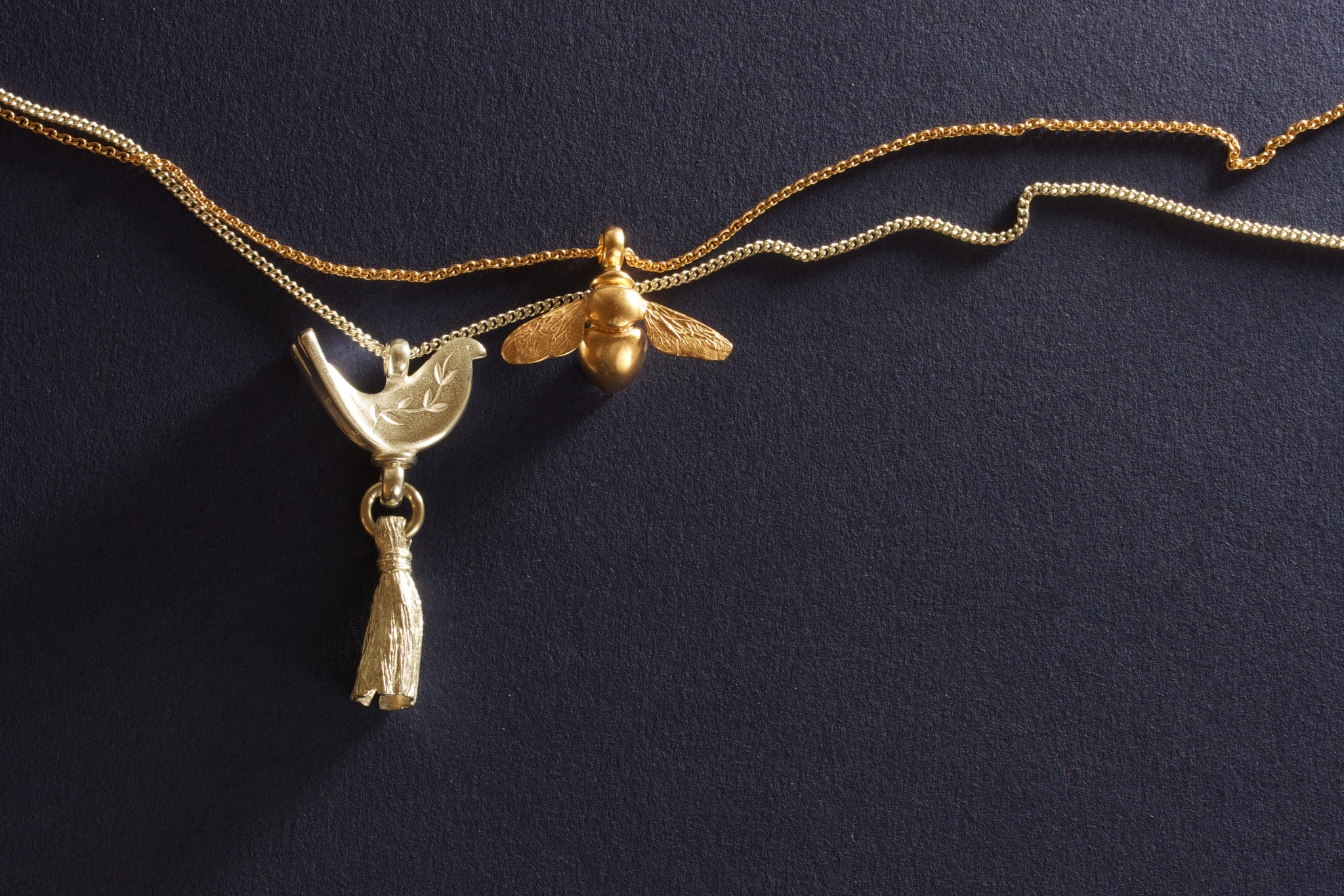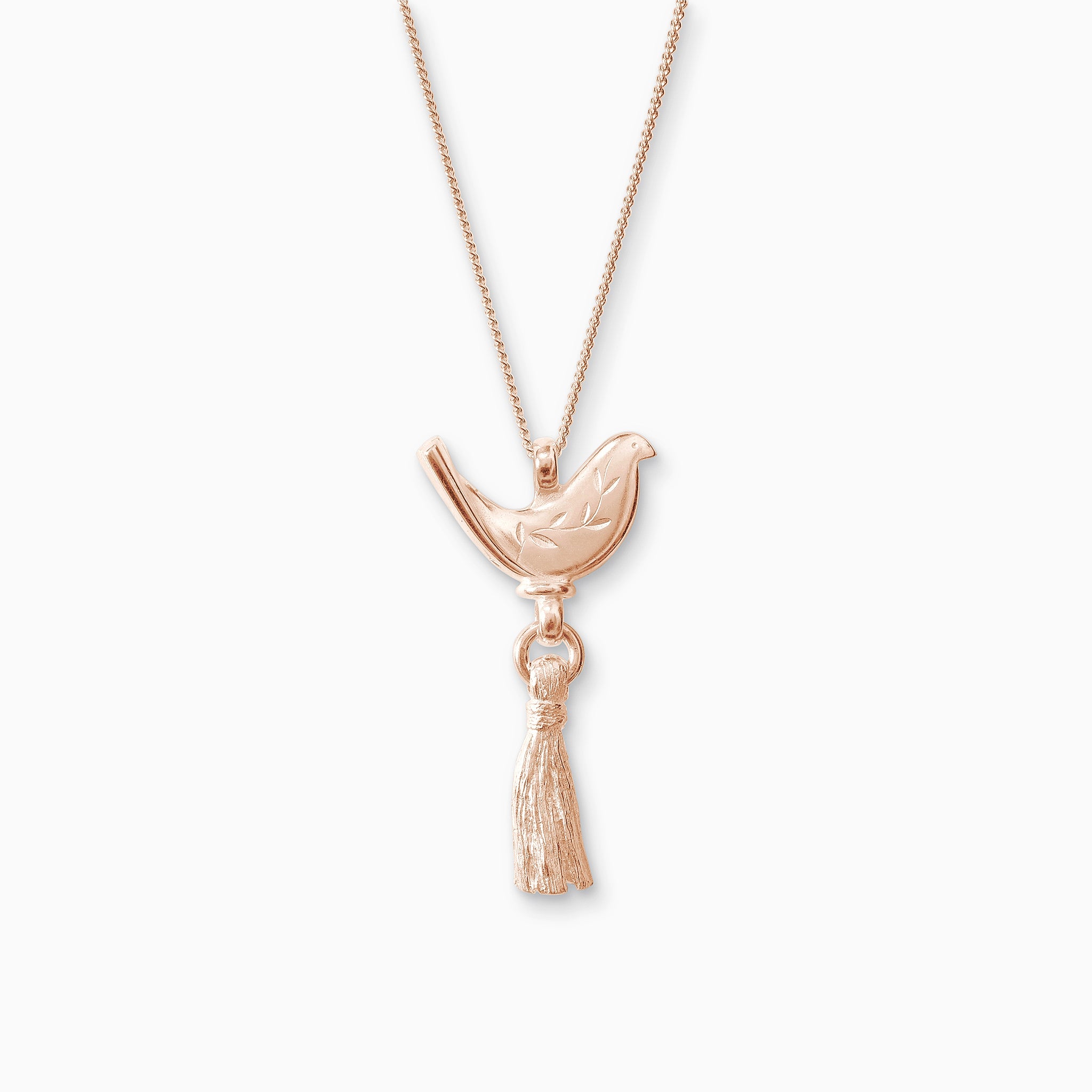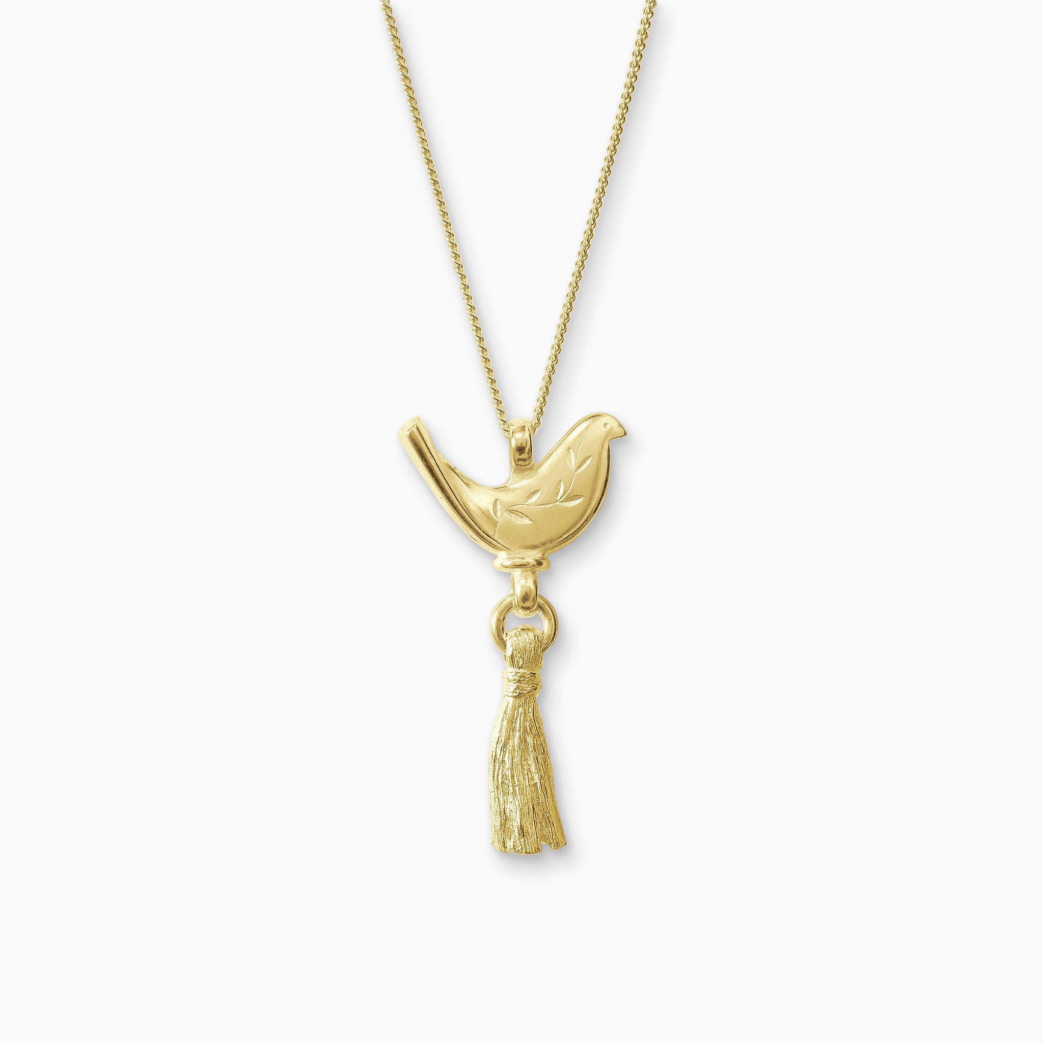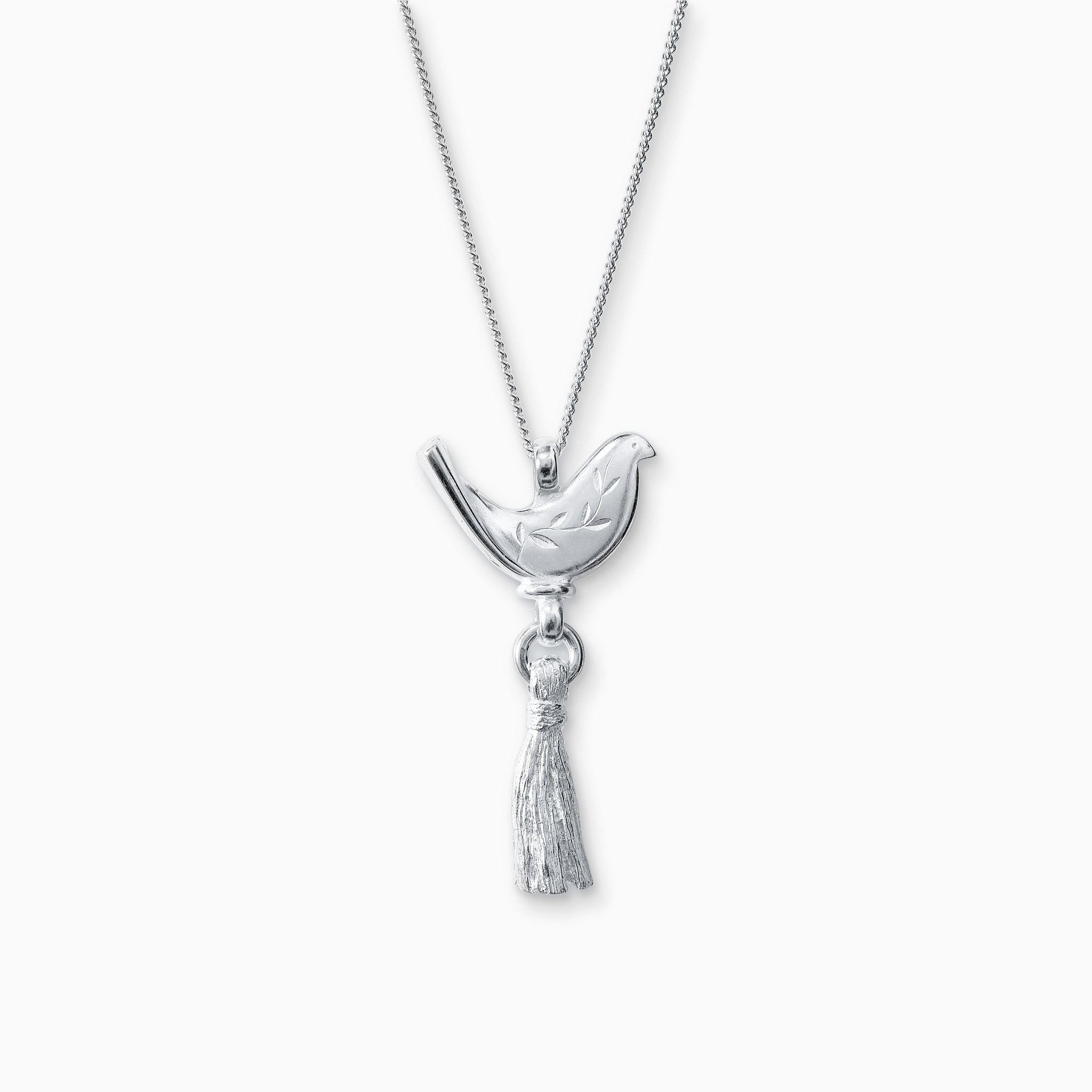 Our elegantly sculptural dove of peace, engraved with tiny olive leaves.Made more spectacular by a silken tassel, cast in perpetual movement. Choose a 75 cm chain if you are after a longer, almost Art Deco feel.
