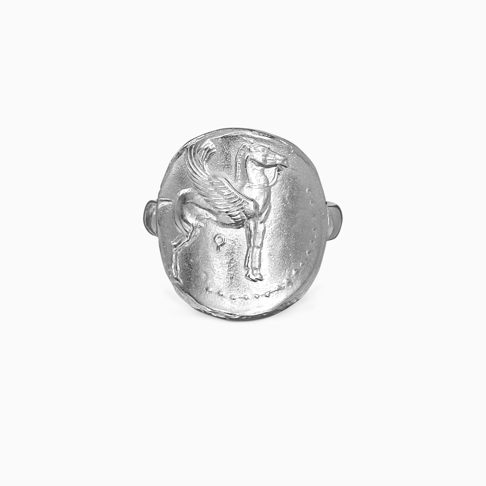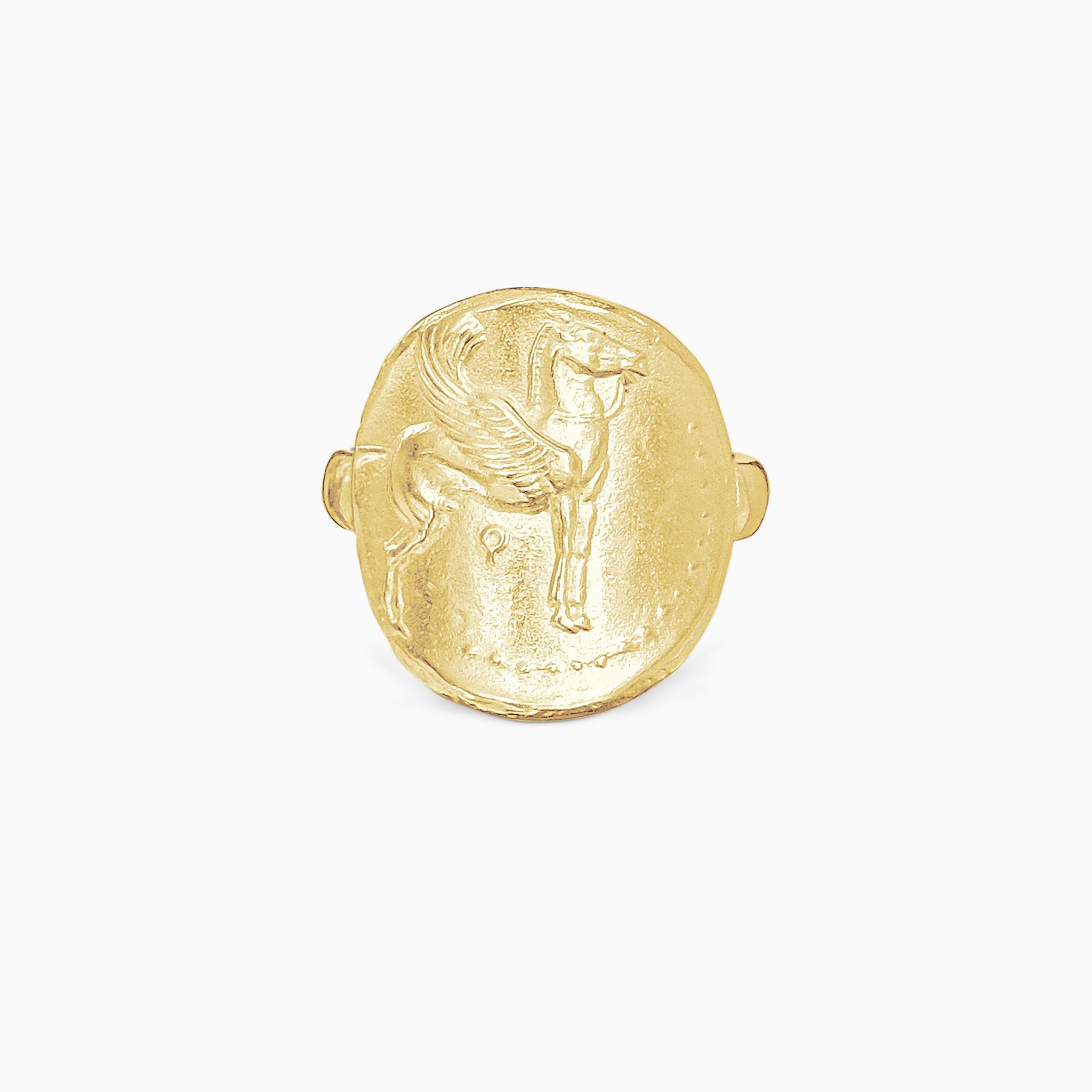 The winged horse of Greek mythology. Legend says that wherever Pegasus strikes his foot, springs of inspiration flow, connecting the energy of the earth with the heavens. Particularly lovely worn on your little finger.