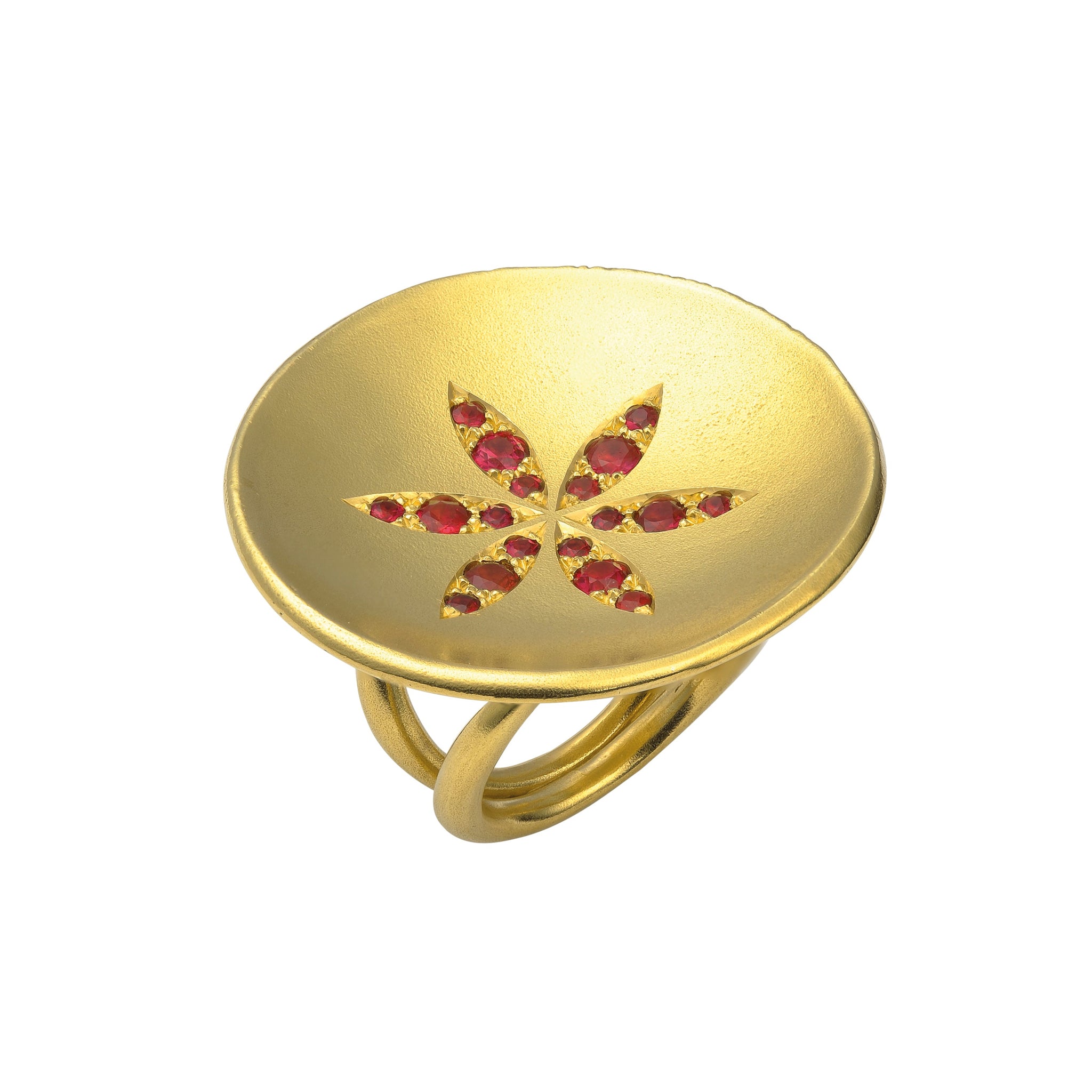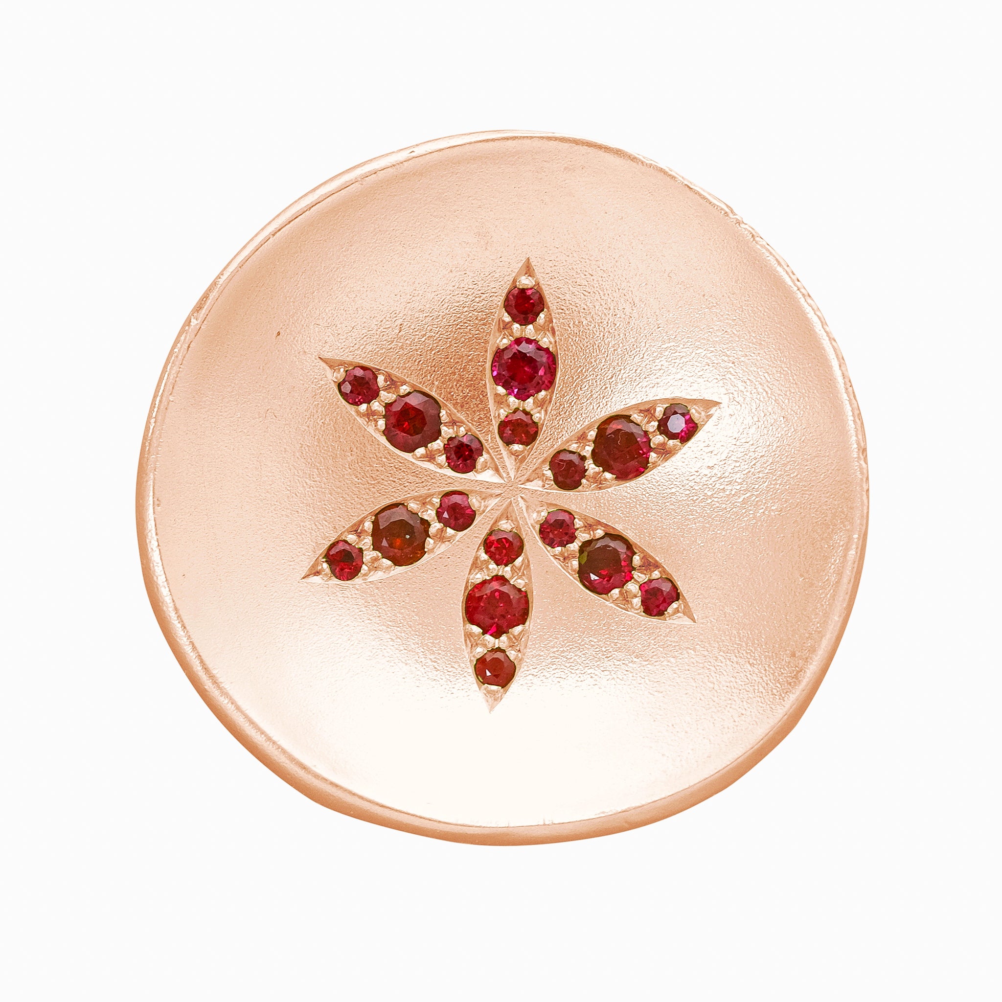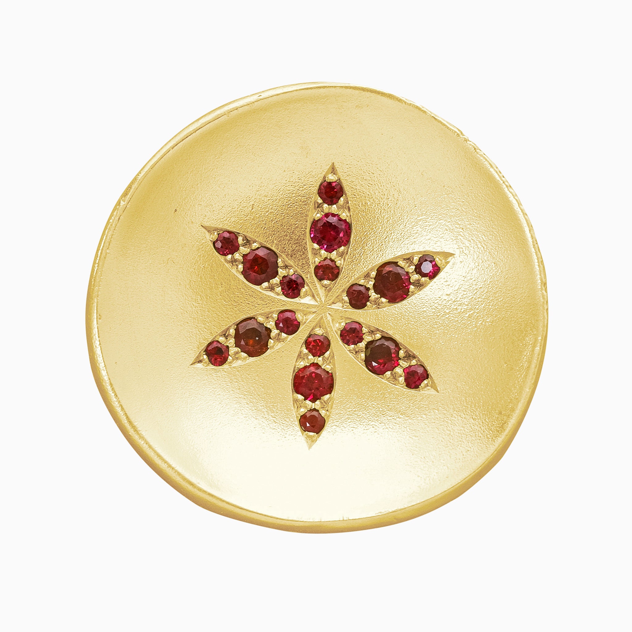 A spectacular disc of yellow gold set with fiery rubies arranged into a flower. We like to think that all our jewellery makes a statement. This makes a rather grand one. Fantastic with diamonds too!
