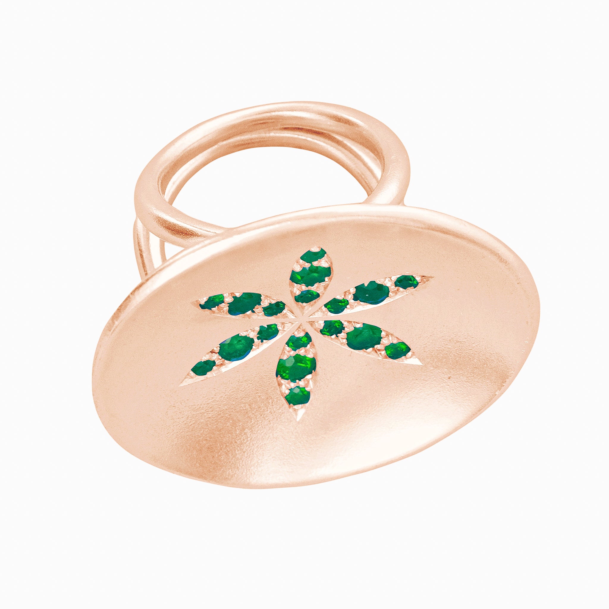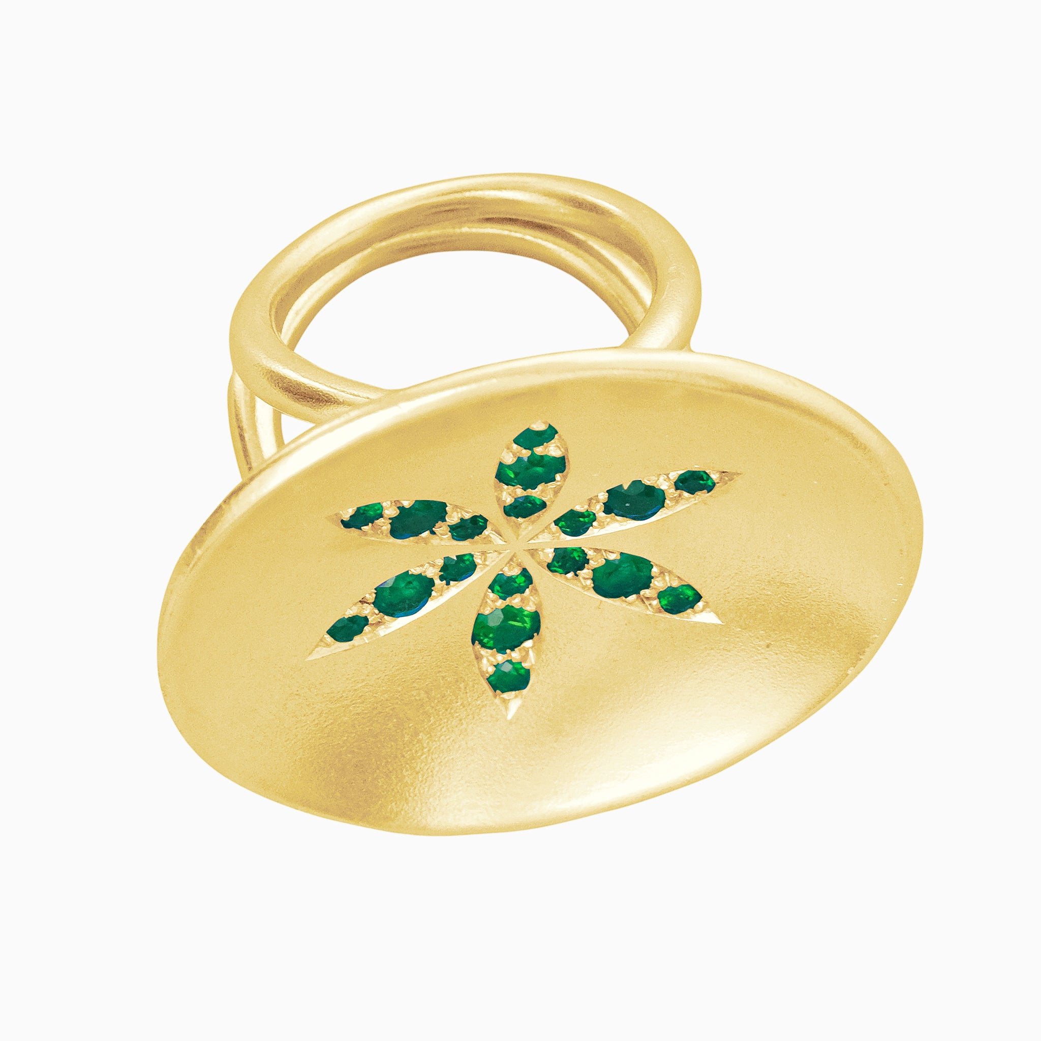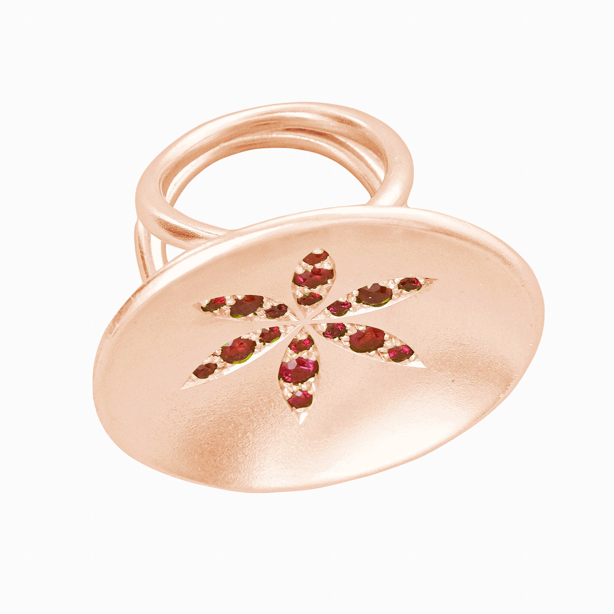 A spectacular disc of yellow gold set with fiery rubies arranged into a flower. We like to think that all our jewellery makes a statement. This makes a rather grand one. Fantastic with diamonds too!